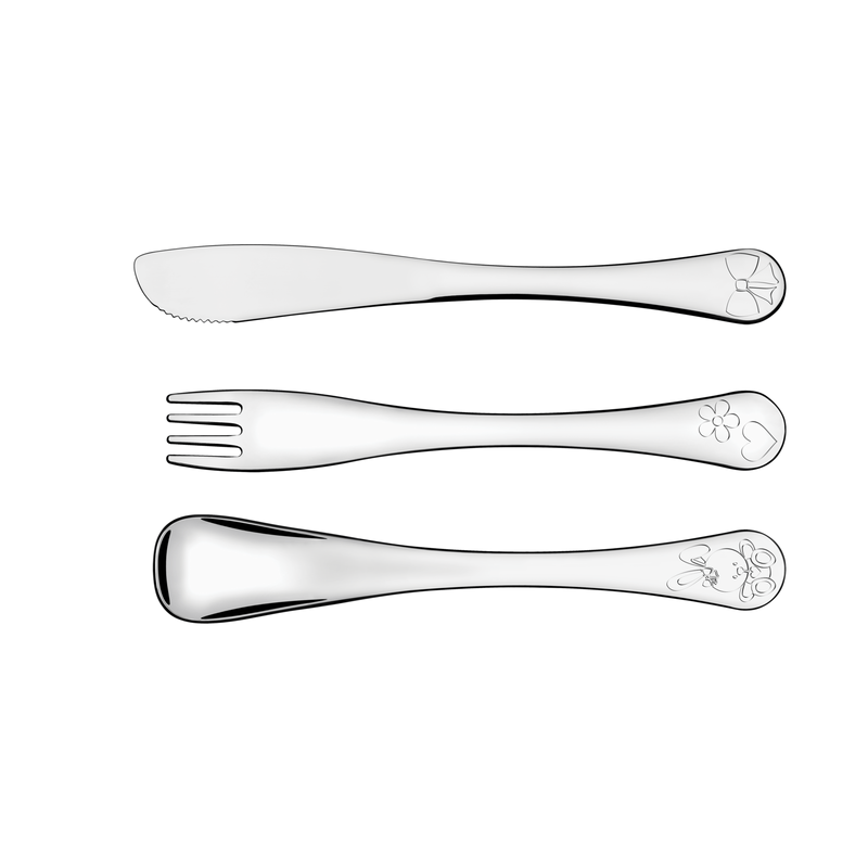 La línea Le Petit trae el juego de cubiertos Tramontina de acero inoxidable opción niñas, terminación brillante con dibujo en alto relieve 3 piezas. Un juego con mucha ternura que dejará las comidas de los pequeños mucho más divertidas. Los cubiertos fueron desarrollados con forma ergonómica, buscando facilitar el manejo e incentivar la autonomía, también cuenta con detalles estampados en alto relieve dejando el momento lleno de creatividad y alegría. Las piezas son hechas totalmente de acero inoxidable, garantizando la seguridad de sus hijos, pues no sueltan residuos en los alimentos, manteniéndolos sanos.