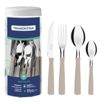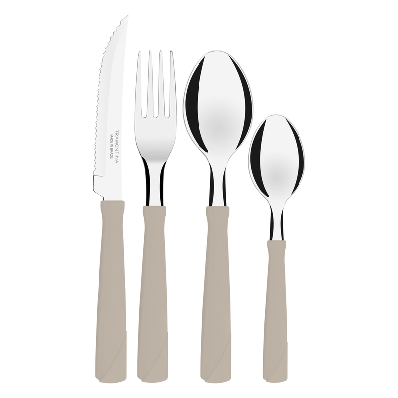 Disfrute un rico almuerzo en familia en compañía del juego de cubiertos Tramontina New Kolor con láminas de acero inoxidable y mangos de polipropileno gris 24 piezas. Posee una lámina de acero inoxidable con tratamiento que ofrece resistencia y durabilidad en el filo y evita deformaciones durante el uso. Su mango es de polipropileno en color gris y ofrece un manejo muy agradable y seguro. Incorpore más color a su mesa y haga aún más especiales sus comidas con Tramontina!