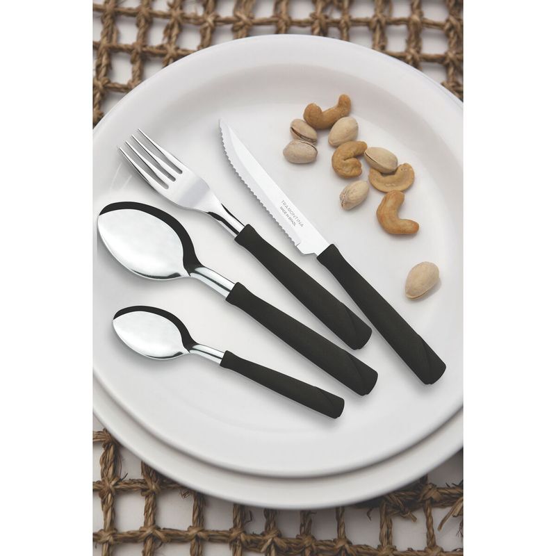 Tu casa merece artículos de calidad que puedan dejar tus comidas más completas y agradables. Con el Juego de Cubiertos Tramontina New Kolor con Láminas de Acero Inoxidable y Mangos de Polipropileno Negro 24 Piezas garantizas toda la calidad y belleza que Tramontina te puede ofrecer. El juego tiene tenedores, cucharas y cuchillos con láminas de acero inoxidable y mangos de polipropileno que propician mejor manejo, ya que el formato anatómico de los mangos permite un encaje perfecto en la mano. Los cuchillos tienen láminas templadas, lo que le ofrece resistencia y durabilidad a su filo de corte. Y para que tengas todavía más facilidad, las piezas se pueden llevar al lavavajillas. Así, tu día a día queda todavía mejor.