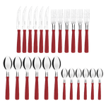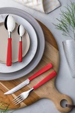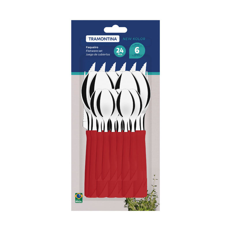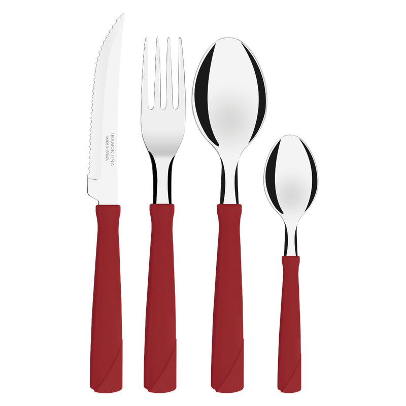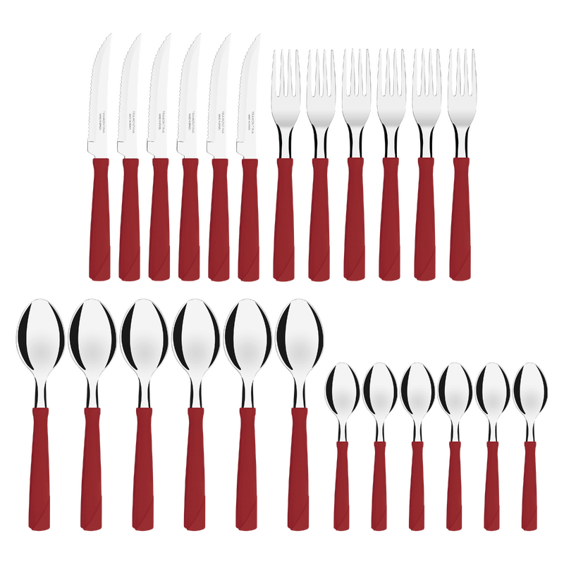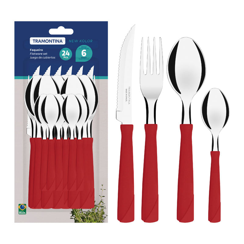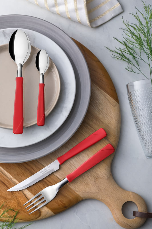 Sorprende a tus invitados con cubiertos que dejarán tus comidas todavía más agradables y prácticas. El juego de cubiertos Tramontina New Kolor con láminas de acero inoxidable y mangos de polipropileno rojo 24 piezas tiene cucharas, tenedores y cuchillos con láminas de acero inoxidable y mangos de polipropileno. Así, su manejo es todavía más agradable, ya que el formato de su mango propicia un encaje mejor para la mano. Y para que tus piezas sean todavía más resistentes, se someten a procesos que le ofrecen durabilidad a las láminas y larga vida al filo. Lo mejor de todo es que los puedes llevar al lavavajillas sin que eso comprometa las características originales del producto.