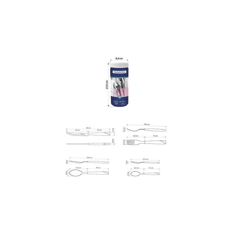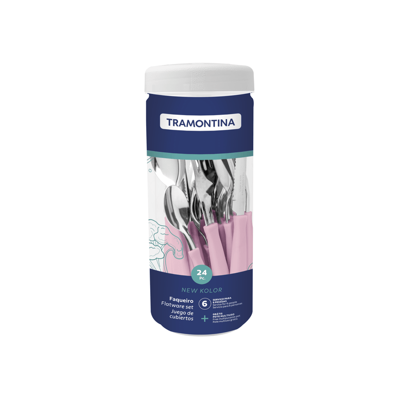 Añada encanto y funcionalidad a sus comidas con el juego de cubiertos Tramontina New Kolor con láminas en acero inoxidable y mangos de polipropileno rosa de 24 piezas. Además de un aspecto moderno y delicado, ofrece resistencia y durabilidad gracias a las láminas de acero inoxidable. Los cuchillos cuentan con láminas templadas, lo que asegura cortes precisos y alarga la vida útil de las piezas. Los mangos de polipropileno aportan comodidad y seguridad en el uso. Práctico y fácil de limpiar, es apto para el lavavajillas, su día a día será más fácil con estilo y eficiencia!