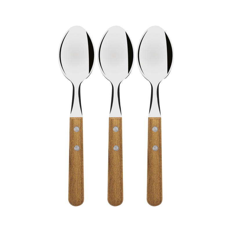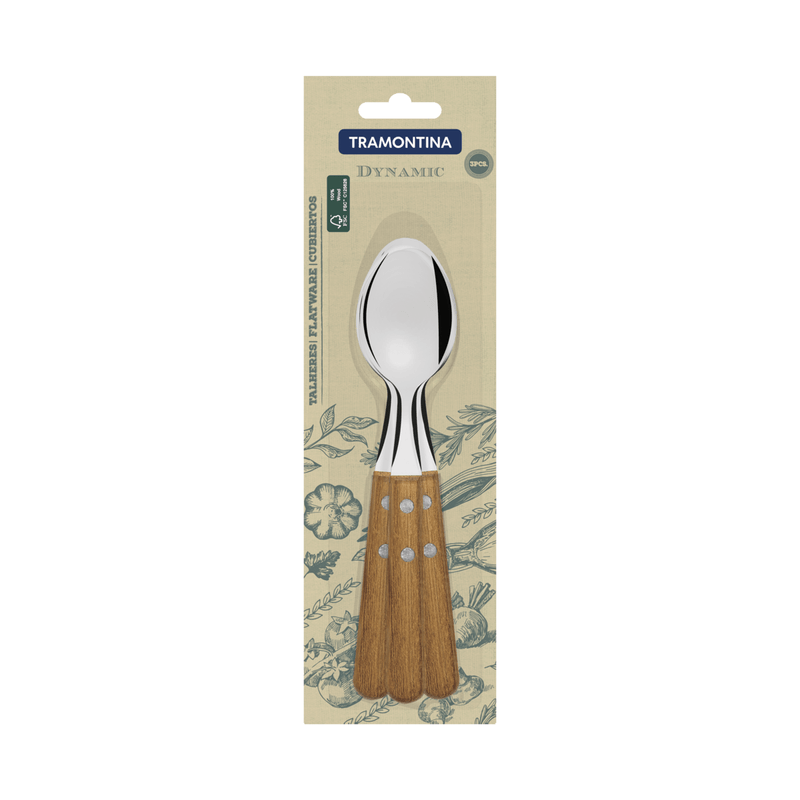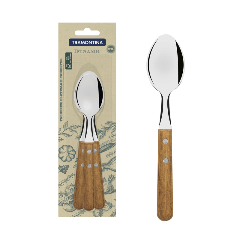 Para un día a día lleno de estilo y buen gusto, el juego de cucharas de mesa Tramontina Dynamic con láminas en acero inoxidable y mangos de madera natural de 03 piezas es la elección ideal. Fabricadas con mangos de madera natural con remaches de aluminio y láminas de acero inoxidable, las piezas son duraderas y resistentes. Su diseño es tradicional y proporciona u n aspecto rústico y distinguido para su mesa!