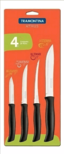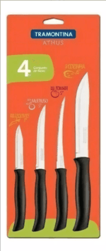 Este Juego de cuchillos Athus Tramontina es el complemento perfecto para tu cocina. Consta de cuatro cuchillos de alta calidad, cada uno con una cuchilla de acero inoxidable, material reconocido por su durabilidad y resistencia al desgaste. Las cuchillas están afiladas para un corte preciso y fácil, lo que hace que cocinar sea un verdadero placer. Los mangos de los cuchillos son de color negro, un tono que aporta un toque de elegancia y sofisticación a cualquier cocina. Están hechos de polipropileno, un material que es cómodo de manejar y fácil de limpiar. Además, este material es resistente, lo que garantiza una larga vida útil para estos cuchillos. El modelo Athus de Tramontina es conocido por su excelente rendimiento y calidad. Este Juego de cuatro cuchillos es perfecto para todas tus necesidades de corte en la cocina, ya sea que estés preparando una comida para uno o para una multitud. El juego contiene: 1 Cuchillo para legumbres 3" 18 cm, 1 Cuchillo multiuso 5" 21,5 cm, 1 Cuchillo para frutas y verduras 5" 22,5 cm, y 1 Cuchillo para cocina 6" 27,5 cm.