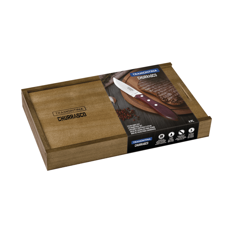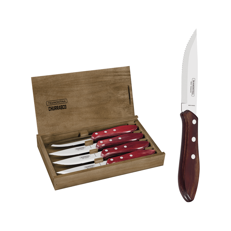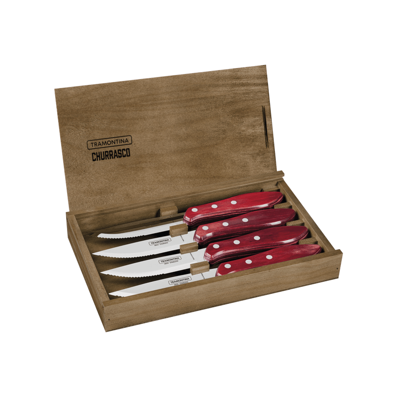 Para garantizar un bellísimo asado, precisamos contar con las herramientas adecuadas. Tramontina sabe eso y ofrece lo mejor que hay con el juego de cuchillos para asado Fandango Tramontina con láminas de acero inoxidable con mango rojo Polywood con estuche de madera 4 piezas de la línea Churrasco. Sus cuchillos se fabrican con láminas de acero inoxidable, mangos de madera tratada Polywood, son resistentes a impactos y altas temperaturas y tienen remaches de acero inoxidable. Prepárate para apreciar cada momento!