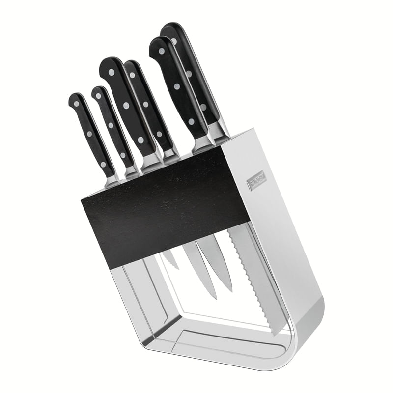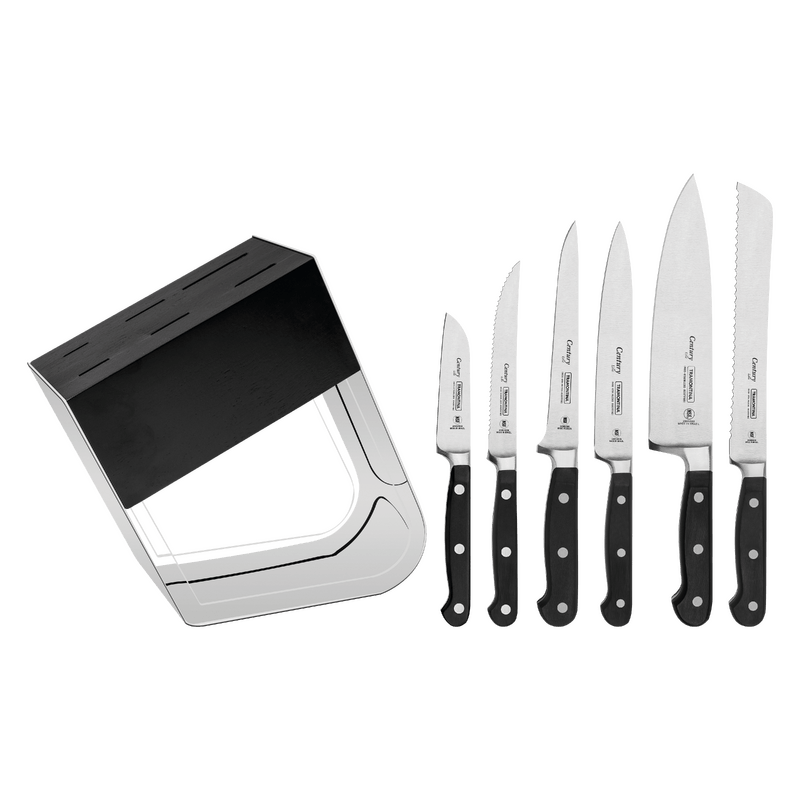 La rutina en la cocina será aún más práctica con cuchillos de alta calidad. Con el juego de cuchillos Tramontina Century con láminas en acero inoxidable y mangos en policarbonato y fibra de vidrio con Soporte de 7 piezas obtendrá las mejores herramientas a su alcance. Las láminas están forjadas en acero inoxidable especial con tratamiento térmico diferenciado, los mangos son anatómicos y ergonómicos fabricados en policarbonato reforzado con fibra de vidrio, y ofrecen una elevada durabilidad, equilibrio y seguridad durante el uso para que los cortes sean más cómodos. Para facilitar aún más su rutina diaria, los cuchillos son aptos para lavar en lavavajillas. El juego incluye un soporte de acrílico con acero inoxidable, que además de proteger las piezas, aporta un toque de elegancia a su mesada. ¡Sorpréndase con la calidad y practicidad del juego de cuchillos Tramontina Century y transforme su experiencia en la cocina en momentos especiales y eficientes!