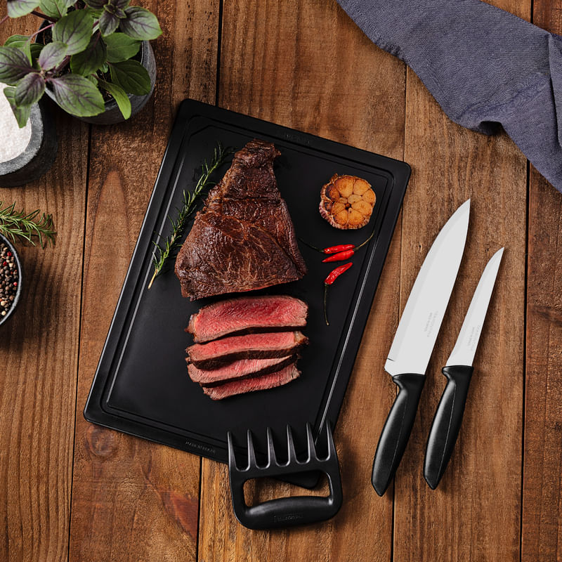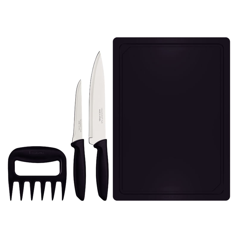 El juego de cuchillos Tramontina Plenus con láminas en acero inoxidable mangos de polipropileno negro y tabla para cortar de 4 piezas es fundamental en cualquier cocina. El juego contine 2 cuchillos, una garra multiuso y una tabla que satisfacen diferentes usos y necesidades: desde preparar los alimentos hasta el servicio de mesa. Ideal para cortar carnes y verduras, incluye una tabla de corte de polipropileno de color negro. Las láminas en acero inoxidable son resistentes. Fáciles de limpiar, son aptos para lavavajillas.