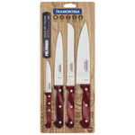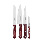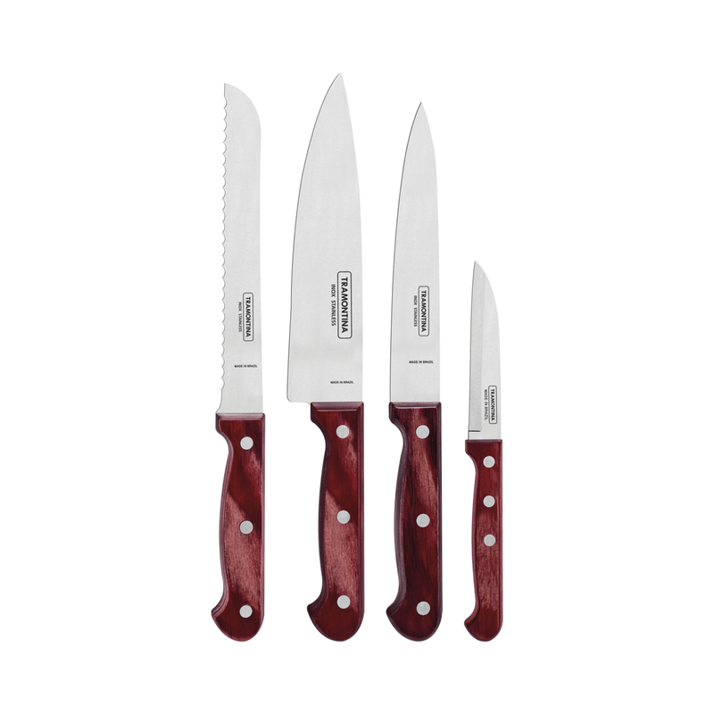 Nada mejor que contar con el juego de cuchillos Tramontina Polywood con láminas de acero inoxidable y mangos de madera tratada rojo de 4 piezas. El juego incluye cuchillos esenciales para su cocina lo que le aporta practicidad y calidad en el día a día. Las láminas están fabricadas en acero inoxidable con tratamiento térmico lo que garantiza un alto poder de corte gran resistencia y una excelente durabilidad. Los mangos están fabricados en madera tratada Polywood lo que le aporta mayor durabilidad resistencia a impactos y altas temperaturas además de un estilo especial para su cocina. ¡Garantice calidad para su día a día en la preparación de las comidas para ello cuente con la línea Tramontina Polywood! El juego contiene: 1 Cuchillo legumbres 3", 1 Cuchillo para Carne 7", 1 Cuchillo de Cocina 6", 1 Cuchillo para Pan 7".