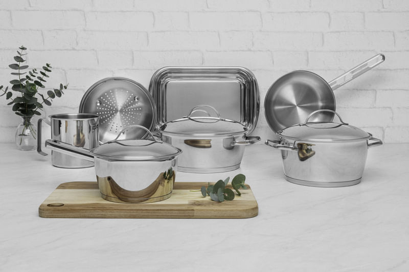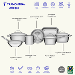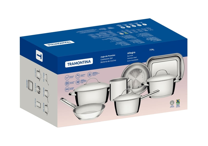 Tu cocina estará más completa con la batería de cocina Allegra de acero inoxidable de 7 piezas con base triple de Tramontina. Incluye siete piezas perfectas para preparar diferentes tipos de platos, tanto sencillos como complejos. Cuentan con una base triple (acero inoxidable + aluminio + acero inoxidable), tecnología que distribuye el calor uniformemente para una cocción más rápida y ahorra energía. Estos elegantes productos están hechos completamente de acero inoxidable. Aportarán belleza a tu cocina con un toque de elegancia y estilo. Su diseño contemporáneo incluye una tapa de cierre hermético con salida de vapor para facilitar su uso. Ideal para tus tareas diarias o para reunir a tus seres queridos. Además, son muy versátiles, ya que se pueden usar en el horno y en diferentes tipos de cocinas.