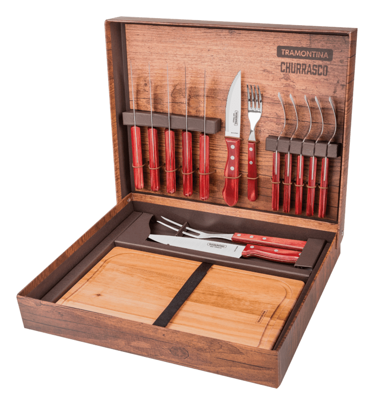 El asador siempre es el último que se sienta a la mesa. Pero para garantizar que los invitados también traten al asado con respeto, nada mejor que elegir los cubiertos adecuados para eso. La línea Churrasco de Tramontina tiene mangos de madera que resisten a la intemperie y a la humedad. Con láminas de acero inoxidable para garantizar el corte perfecto de las carnes. El juego contiene 1 Cuchillo Chef 8", 1 Tenedor Trinchante, 6 Tenedores para Asado, 6 TCuchillos para asado Jumbo 5"