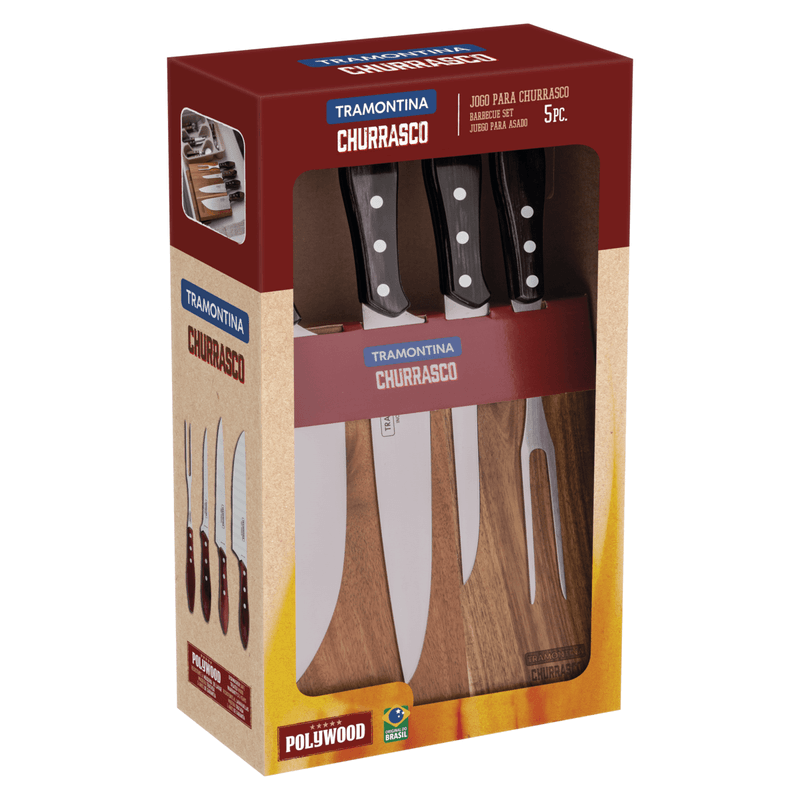 Prepara tus mejores asados con más estilo y practicidad con el Juego para Asado Tramontina con Láminas de Acero Inoxidable y Mangos de Madera Polywood Marrón 5 Piezas. Perfecto para cortar y servir los mejores cortes de carne el juego cuenta con cuchillos para carne cuchillo para deshuesar tenedor trinchante y cepo magnético todos utensilios esenciales para preparar y servir un buen asado. Las piezas tienen láminas de acero inoxidable y mangos de madera Polywood tratada ambas características que hacen que sea un juego de alta calidad y resistencia. No puede faltar en tu casa. El Juego contiene: 1 Cuchillo carne 8", 1 Cuchillo carne con vaina, 1 Cuchillo filetear 6" Polywood, 1 Tenedor trinchante Polywood y 1 Soporte Magnético.