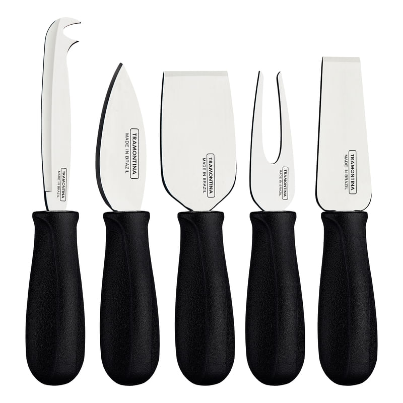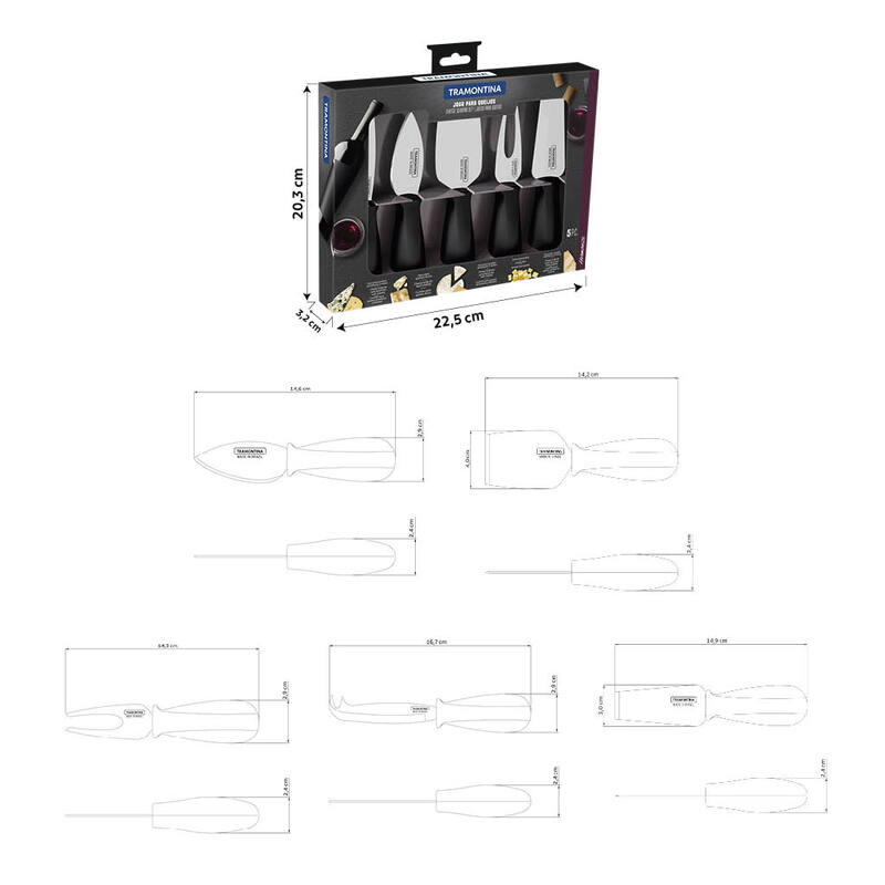 Existen algunas preferencias nacionales y, sin duda, el queso está entre ellas. Y ahora puedes contar con la ayuda del juego para quesos Tramontina Harmoniza con lámina de acero inoxidable y mangos de polipropileno negro 5 piezas, además de adquirir mucho estilo y practicidad en tu mesa. Los cuchillos se pueden usar en diversos tipos y espesores de quesos y el tenedor es altamente resistente. Mucho estilo y calidad en un juego pensado especialmente para ti. No dejes de aprovechar.
