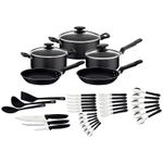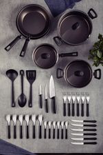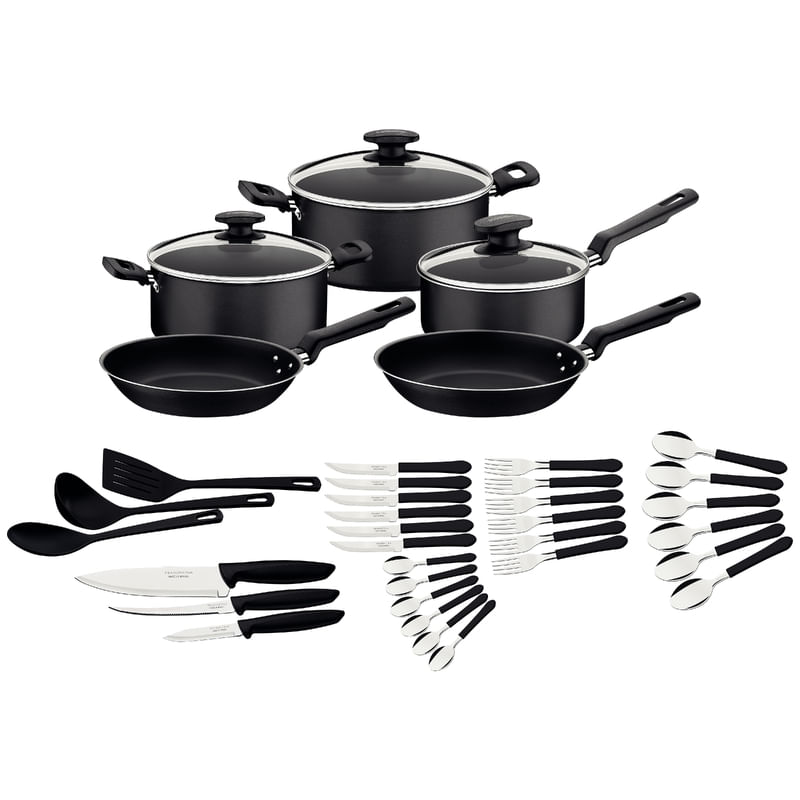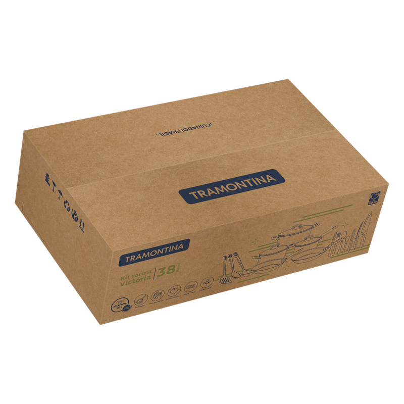 El kit de cocina Tramontina Victória en aluminio con revestimiento Interno y externo con antiadherente Starflon Max de 38 piezas es la elección ideal para quienes desean completar su cocina, garantizar alta calidad en la preparación de las comidas y componer la mesa. Está compuesto de piezas fundamentales para su día a día, como las de horno y cocina, que están producidas en aluminio con revestimiento interno con antiadherente Starflon Max y cocinan los alimentos de manera rápida y uniforme, sin que se peguen en la superficie. Las ollas y cacerolas incluyen tapas de vidrio templado con bordes de acero inoxidable y cuentan con mangos y asas de baquelita antitérmica, un material que permite un manejo mucho más confortable y seguro. El kit de cocina también viene con un utensilio de nylon y cubiertos con láminas de acero inoxidable y mangos de polipropileno, que son altamente resistentes y aptos para lavavajillas. ¡Elija Tramontina y obtenga todos los artículos para lucirse en la cocina!