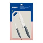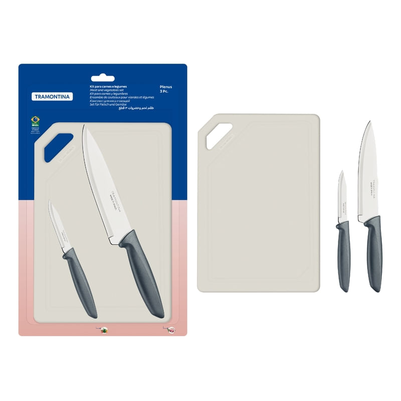 Los cuchillos prácticos y de calidad son fundamentales en nuestra cocina. Con el kit para carnes y legumbres Tramontina Plenus con láminas en acero inoxidable mangos de polipropileno gris y tabla para cortar de 3 piezas encontrará piezas que sirven para los más variados usos. Están presentes en las principales comidas y las tres piezas cumplen un rol en la cocina. Ideal para cortar carnes y legumbres, son aptas para lavavajillas. Producidas con mangos de polipropileno gris, lámina de acero inoxidable y tabla de polipropileno, son resistentes y fáciles de manipular.