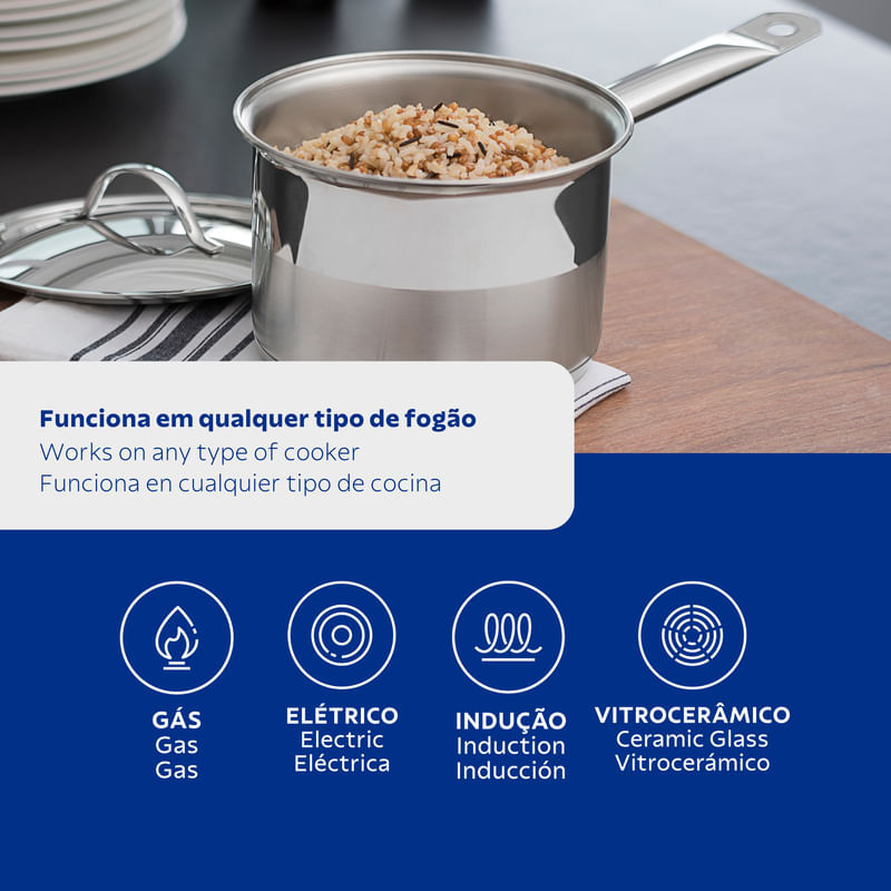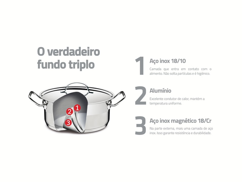 Para hacer todo el proceso de construcción de un plato mucho más ágil, la olla Tramontina de acero inoxidable fondo triple con tapa plana detalle satinado y mango 16 cm de diámetro 2,2 L proporcionará una cocción rápida de los ingredientes, pues cuenta con fondo triple (acero inoxidable + aluminio + acero inoxidable) que distribuye uniformemente el calor por la olla. Sus características garantizan toda la agilidad que una cocina necesita, mango reforzado y la posibilidad de usarse tanto en el fogón como en el horno. Como toda cocina debe ser impecable, la olla alta es fácil de limpiar y mantener el brillo único de acero inoxidable con su detalle satinado. Un producto más de la línea Professional.