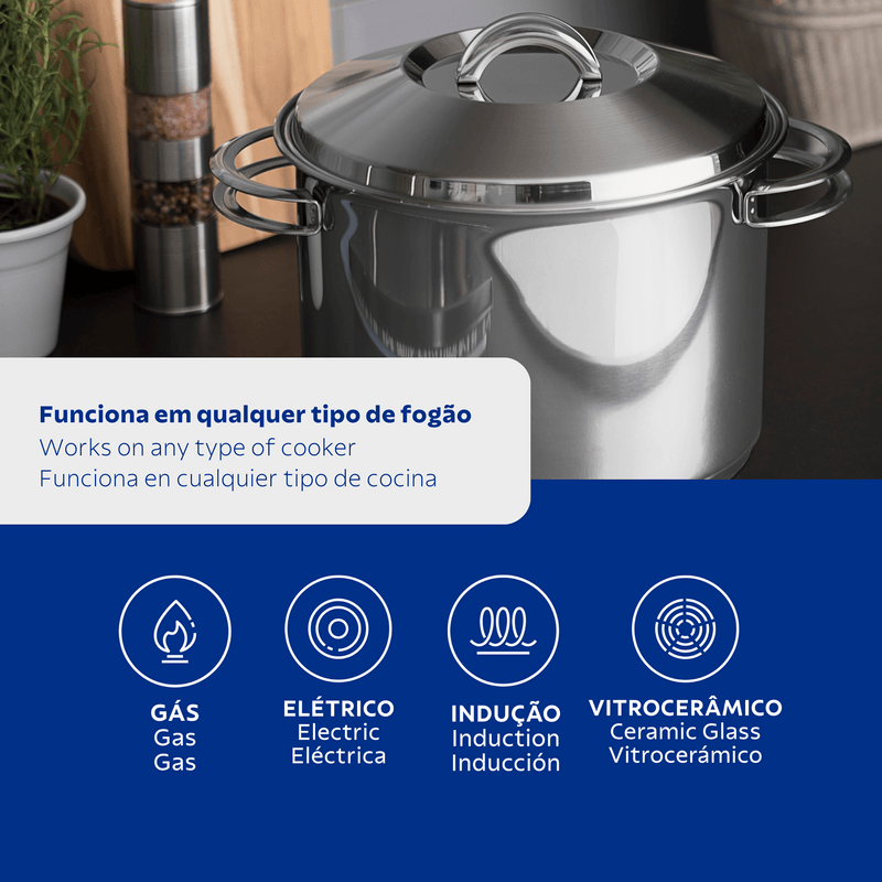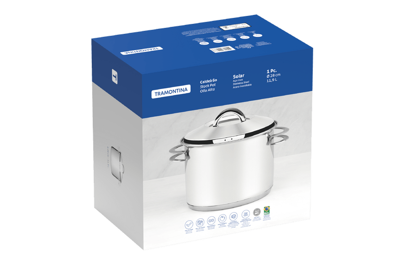 Sea para uso profesional o casero, la olla alta Tramontina de acero inoxidable fondo triple con tapa y asas 28 cm de diámetro 11,9 L de la línea Solar, garantiza un desempeño de calidad. Por ser fabricada totalmente de acero inoxidable, la olla alta no suelta ningún tipo de residuo, manteniendo los alimentos saludables y las recetas con su toque de condimentos. El fondo triple (acero inoxidable + aluminio + acero inoxidable) producido con alta tecnología proporciona que los alimentos sean cocinados de forma rápida y por igual. Encante paladares y corazones con sus recetas.