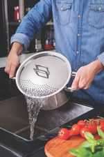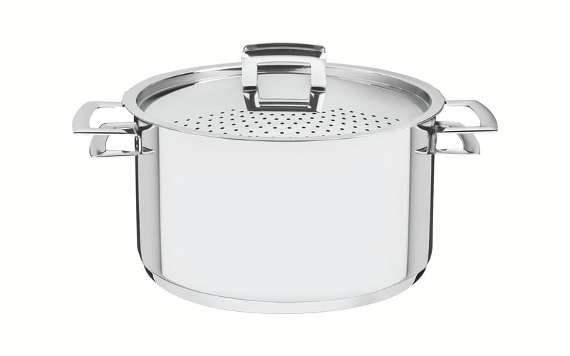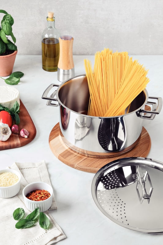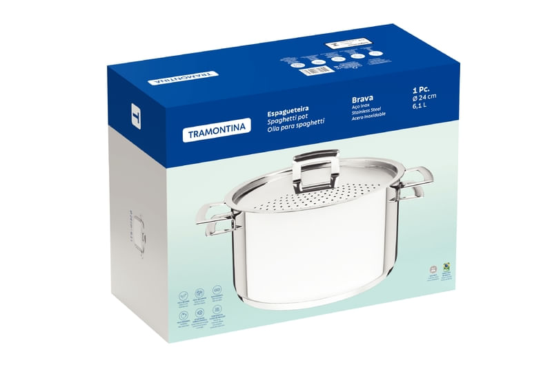 La olla para spaghetti Brava de acero inoxidable con fondo triple, tapa y asas de 24 cm y 6,1 l Tramontina hace que las recetas de pasta sean mucho más fáciles y sabrosas. Hecha de acero inoxidable, posee una tapa con encaje en la olla y agujeros para escurrir el agua de la pasta, facilitando la preparación y haciendo las actividades mucho más rápidas. Es una olla de 24 cm de diámetro con capacidad para 6,1 litros y además, hará que su cocina sea más hermosa y con mucho estilo debido a su elegante brillo.