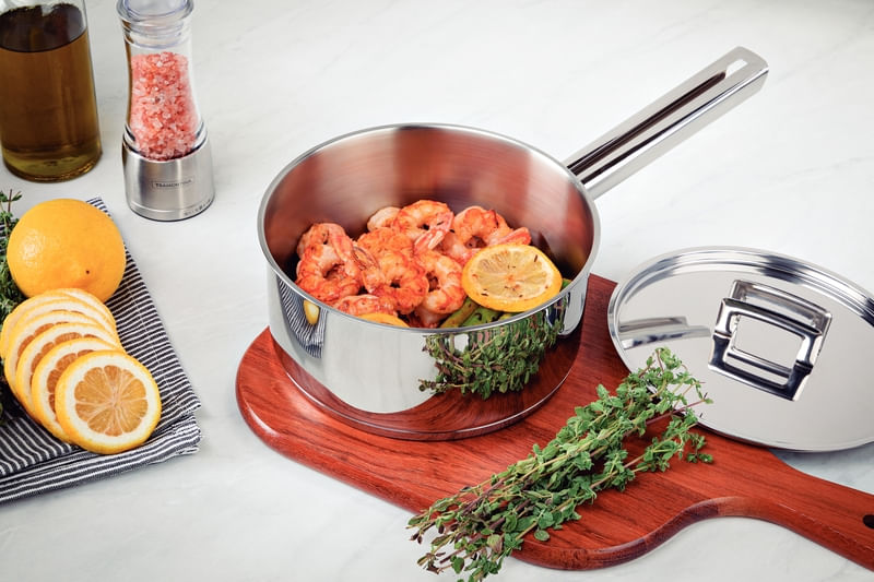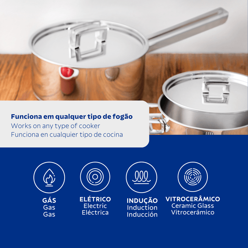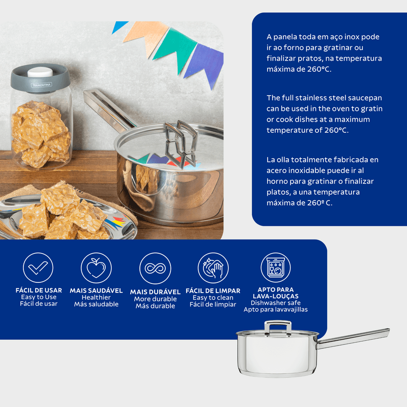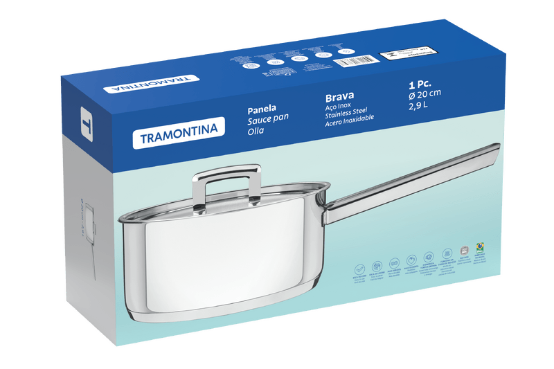 Prepare sus recetas favoritas de una forma práctica y exquisita. La Olla Tramontina de Acero Inoxidable Fondo Triple con Tapa Plana y Mango 20 cm de diámetro 2,9 L de la línea Brava ofrece la posibilidad de hacer diversas preparaciones y encantar a las personas que usted más ama con platos perfectos. Su fondo triple (acero inoxidable + aluminio + acero inoxidable) dejará la preparación aún más fácil, porque distribuye uniformemente el calor y mantiene la comida caliente por mucho más tiempo. Con terminación alto brillo con diseño moderno, que dejará su cocina aún más elegante, sin ofuscar al verdadero protagonista: su receta.