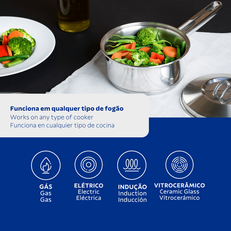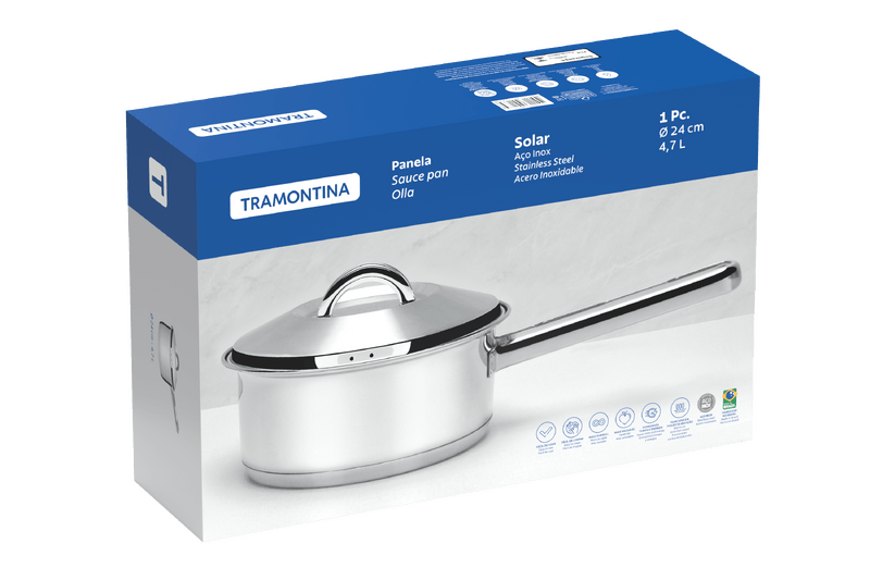 La olla es la fiel compañera de un cocinero, por eso, debe ser resistente y práctica. La línea Solar de Tramontina presenta la olla de acero inoxidable con fondo triple con tapa y mango 24 cm de diámetro 4,7 L, que le ayudará a producir cualquier tipo de receta, sea simple o compleja. La olla de acero inoxidable de Tramontina posee un fondo triple (acero inoxidable + aluminio + acero inoxidable), que permite que los alimentos sean cocinados de forma uniforme, además de mantener el calor por más tiempo. Su tapa cuenta con salida de vapor y un encaje perfecto. Puede ser utilizada tanto en la cocina como en el horno para finalizar (temperatura de hasta 260ºC). Brille en la cocina con las ollas de Tramontina.