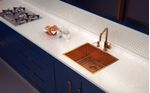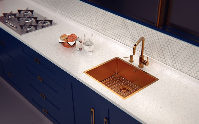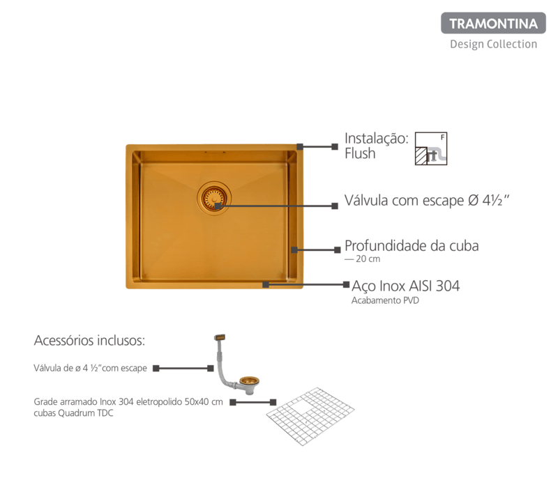 Tu cocina no será la misma con la Pileta Tramontina Design Collection Quadrum en acero inoxidable con recubrimiento en PVD Gold y acabado Satinado 50x40 cm. Con ella vas a garantizarle modernidad y sofisticación a tu cocina, porque se produce con alta tecnología, aliada su fabricación en acero inoxidable, material que le garantiza resistencia y durabilidad. Viene en un lindo color dorado y cuenta con líneas especiales que van a llevarle personalidad y elegancia a tu casa. Su acabado PVD (Physical Vapor Deposition) es un proceso para producir un vapor metálico que se deposita sobre la'pieza como si fuese una fina capa de color. Con profundidad de 20 pulgadas, se adapta a diferentes proyectos y combina con las decoraciones más especiales. Se puede instalar incrustado en el globo (Undermount), en el contador (semiflush) y en el sistema flush, cuando la pileta queda perfectamente nivelada con la mesada. Además viene con válvula de 4 1/2 pulgadas, con escape, lo que hace todavía más fácil su instalación. La elección perfecta para quienes valoran lo mejor.