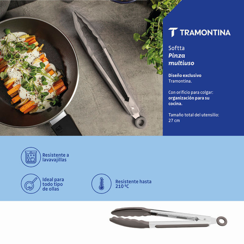 Mejore su cocina con la pinza multiuso Tramontina Softta de silicona gris de 27 centímetros. Fabricada en silicona resistente hasta 210 °C, es perfecta para manipular y servir una variedad de alimentos sin rayar sus ollas. Su diseño ergonómico garantiza confort y control, mientras que la fácil limpieza en lavavajillas aporta practicidad a su rutina. Combine eficiencia y estilo con esta pinza versátil y sofisticada.