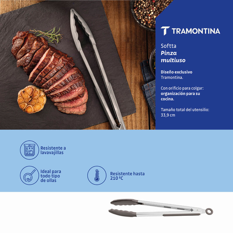 La pinza multiuso Tramontina Softta de silicona gris de 33,9 centímetros es el accesorio ideal para facilitar su rutina diaria en la cocina. Resistente al calor y con un diseño ergonómico, ofrece seguridad y confort al manipular los alimentos calientes. Con sus puntas de silicona, es perfecta para ollas y sartenes antiadherentes, lo que evita las rayas y extiende la vida útil de los utensilios. Además, su acabado gris elegante combina con cualquier ambiente, lo que aporta practicidad y estilo a sus recetas. Versátil y durable, la pinza Softta es la elección correcta para quienes buscan eficiencia y calidad Tramontina.