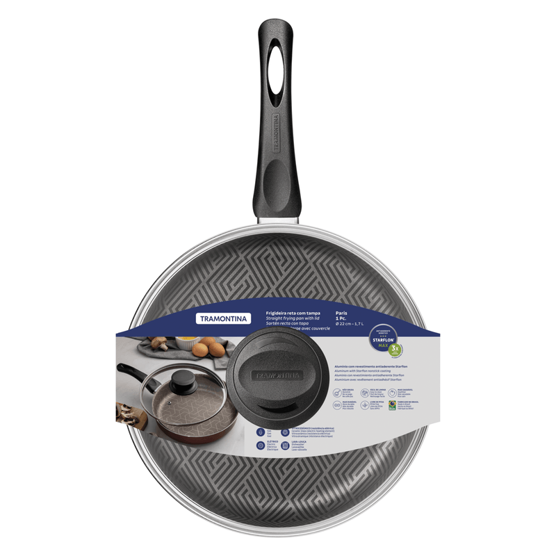 La sartén recta Tramontina Paris en aluminio con revestimiento interno y externo con antiadherente Starflon Max plomo con tapa de vidrio 22 centímetros 1 7 litros su cocina quedará completa y la preparación de sus recetas será mucho más práctica. Está fabricada en aluminio de 1 8 milímetros de espesor, lo que garantiza una cocción rápida y uniforme de los alimentos. Su revestimiento interno y externo es de Starflon Max, un antiadherente que evita que los alimentos se peguen en la superficie, lo que hace que sea más fácil de limpiar, más duradera y no perjudicial a la salud. Su mango es de baquelita antitérmica, no se calienta y garantiza más seguridad y comodidad durante el uso. Además de todas estas características, es apta para lavavajillas, lo que facilita su rutina diaria. Una sartén con toda la calidad Tramontina, que usted ya conoce y en la cual confía!