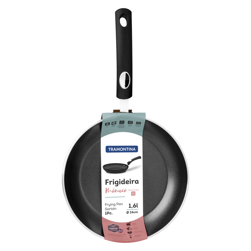 La sartén Tramontina Mónaco Induction en aluminio con revestimiento interno y externo de antiadherente Starflon Premium negro de 24 centímetros de diámetro y 1 6 litros es la elección perfecta para quienes aprecian la calidad en su cocina! Debido al cuerpo de aluminio con espesor de 3 0 mm y al revestimiento interno y externo de antiadherente Starflon Premium, permite una cocción rápida y uniforme de los alimentos, garantiza que no se peguen en la superficie, le brinda durabilidad y no es perjudicial a la salud. Su mango metálico cuenta con protección de silicona y permite la reducción de la propagación del calor, lo que aumenta la seguridad y mejora el manejo. Es muy fácil de limpiar y apta para lavavajillas, lo que facilitará su rutina en la cocina. Con Tramontina obtiene los mejores artículos para equipar su cocina!