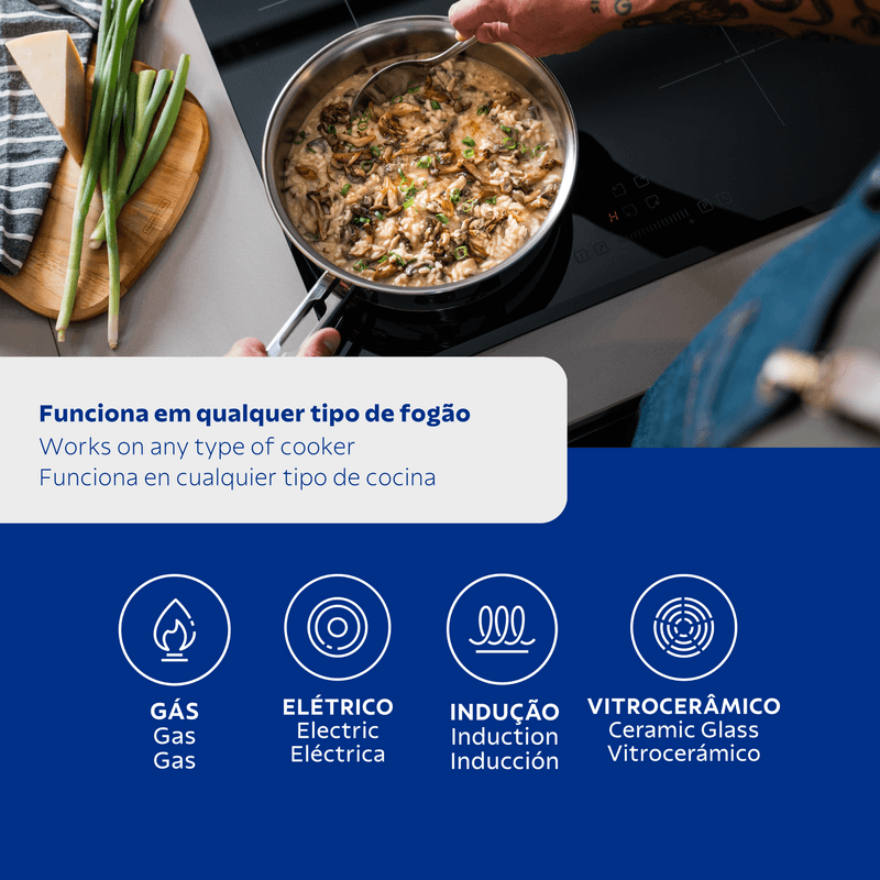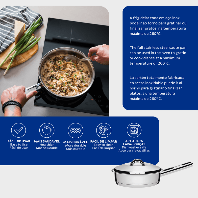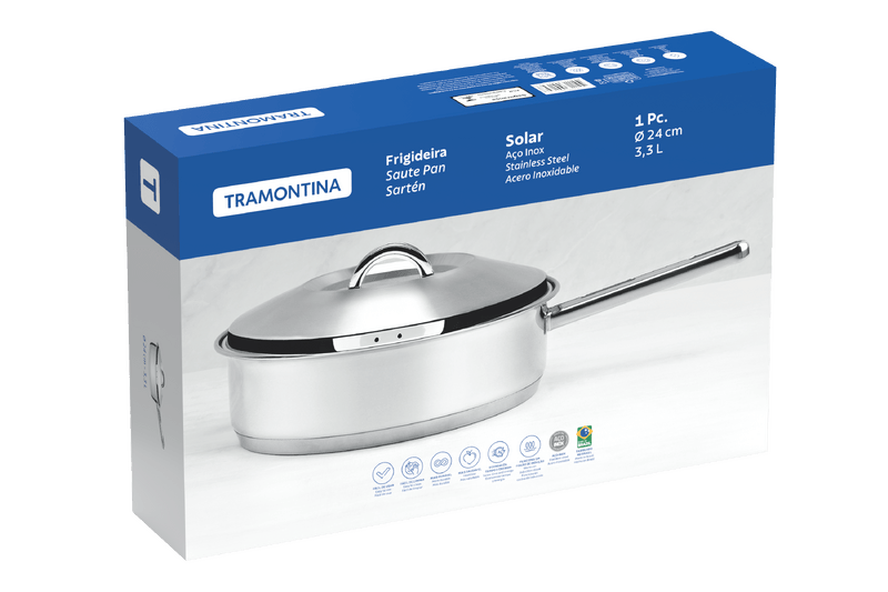 ¿Está listo para realizar recetas increíbles? con el sartén Tramontina de acero inoxidable con fondo triple y tapa 24 cm de diámetro 3,3 L no tendrá límites en la cocina. La línea Solar es símbolo de practicidad y durabilidad, perfecta para aventurarse y preparar numerosos platos. El sartén de Tramontina es hecha de acero inoxidable y posee fondo triple (acero inoxidable + aluminio + acero inoxidable), lo que garantiza que sus alimentos sean cocinados uniformemente y sin alteración de sabor, porque el acero inoxidable no suelta partículas que puedan afectar su producto. Llegó la hora de abrirse al mundo de la gastronomía.