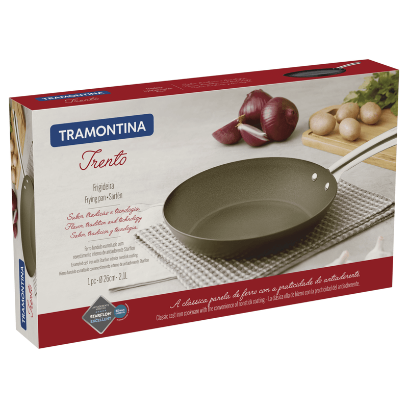 La sartén Tramontina Trento de hierro esmaltado con revestimiento interno antiadherente Starflon Excellent de 26 centímetros y 2 1 litros es indispensable para preparar comidas deliciosas y con sabor casero. Con cuerpo de hierro fundido esmaltado con revestimiento interno antiadherente Starflon Excellent evita que los alimentos se peguen es fácil de limpiar más duradera y no es perjudicial a la salud. Podrá asegurarse un sabor incomparable para sus recetas al cocinarlas de modo rápido y uniforme en todos los tipos de cocinas. ¡Con Tramontina tendrá asegurado el gusto de la comida casera!