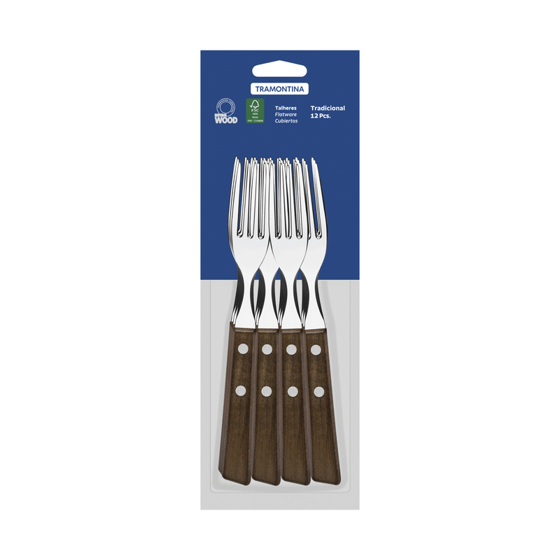 Con el juego de tenedores de mesa Tramontina Tradicional con láminas en acero inoxidable y mangos de madera natural de 12 piezas su cena o almuerzo tendrá la calidad y la belleza que su familia e invitados merecen para disfrutar de una deliciosa comida. Producidos con láminas de acero inoxidable, los tenedores ofrecen mayor resistencia y durabilidad. Los mangos son de madera natural con remaches de aluminio y proporcionan la combinación perfecta para armar una mesa rústica y de calidad!
