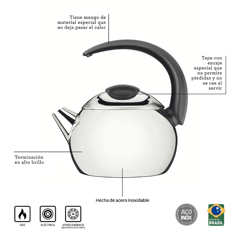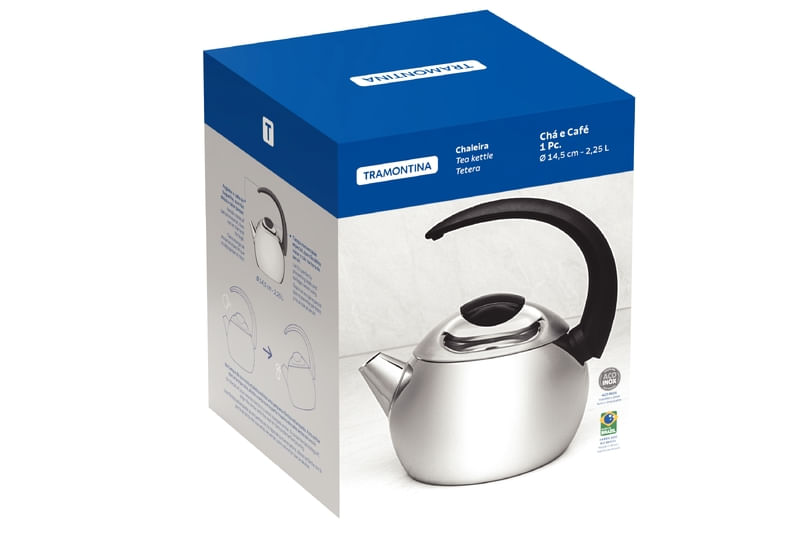 For those who enjoy elegance and safety, Tramontina's 14,5 cm, 2.25 L stainless steel kettle with black handle has a charming design, made of stainless steel with a mirror finish, handle made of heat resistant material, and tight-fitting lid that prevents spills. Many benefits in one single product, your kitchen needs this wonderful item!